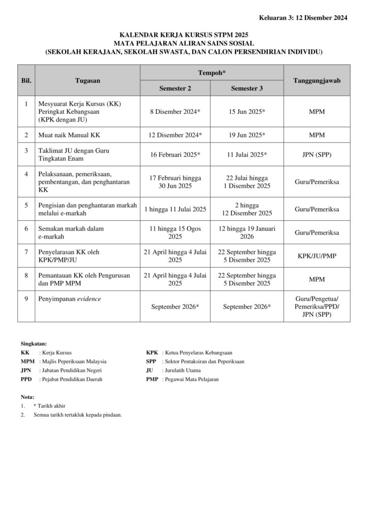 Jadual Kalendar Kerja Kursus STPM 2025 (Bidang Sains Sosial)