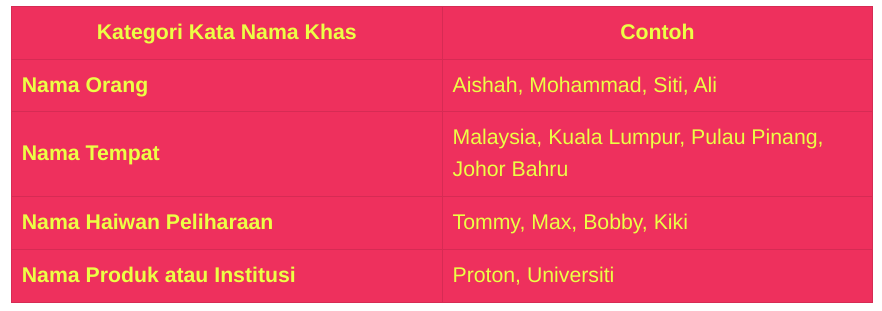 Untuk memahami lebih jelas tentang penggunaan kata nama khas, berikut adalah beberapa contoh ayat yang mengandungi kata nama khas: