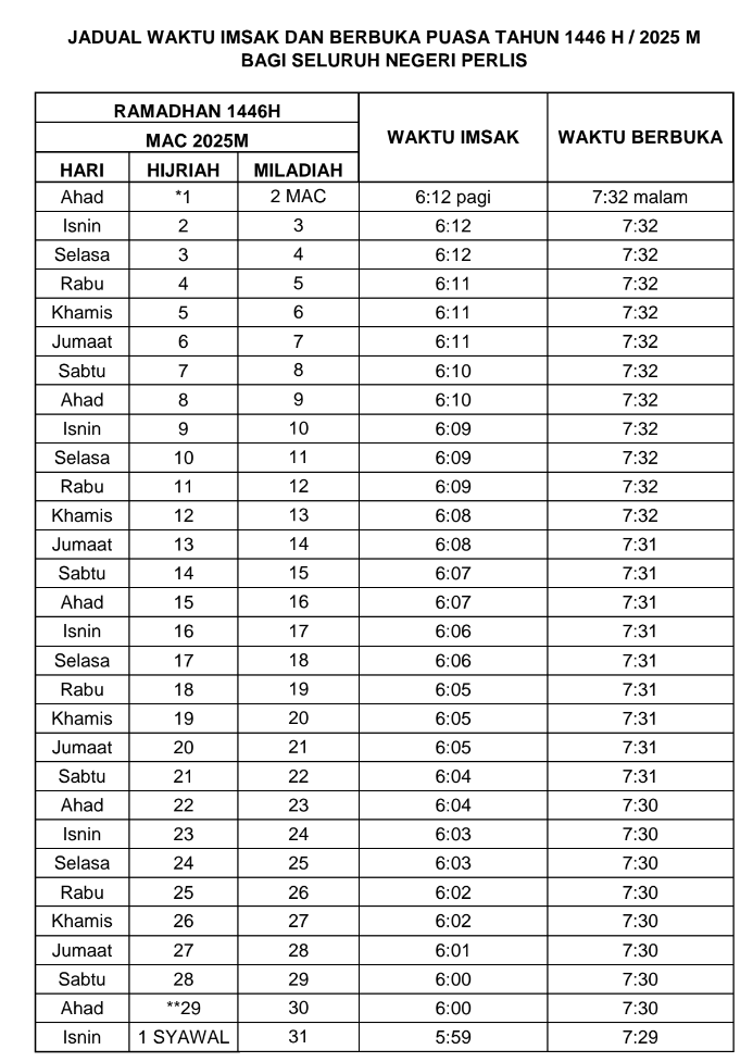 Jadual Waktu Berbuka Puasa dan Imsak negeri Perlis 2025